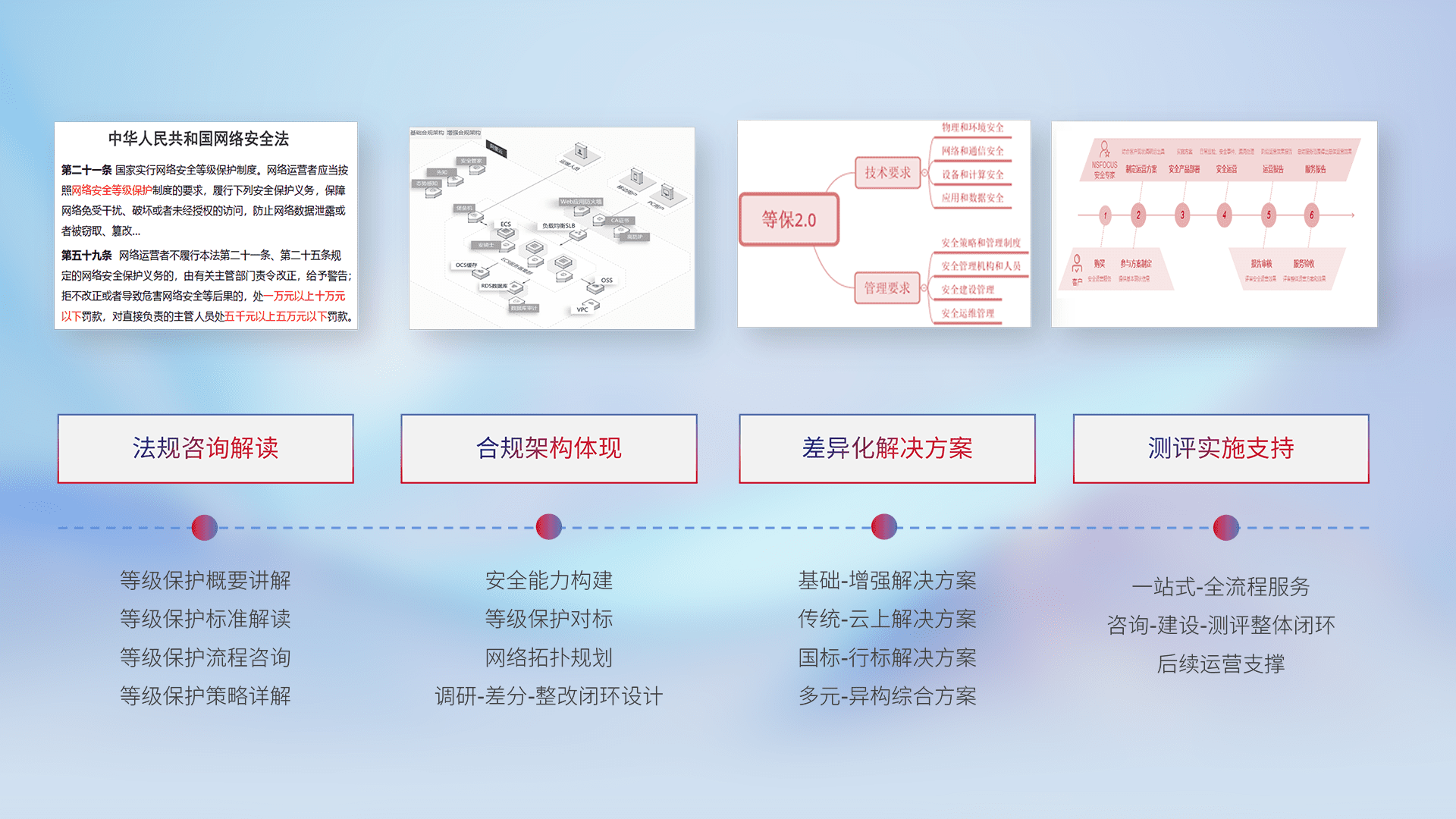 通过专业的法律咨询解读、、、、合规架构体现、、、差异化解决方案、、、测试实施支持等服务,,,为客户量身打造等保合规体系。。。。